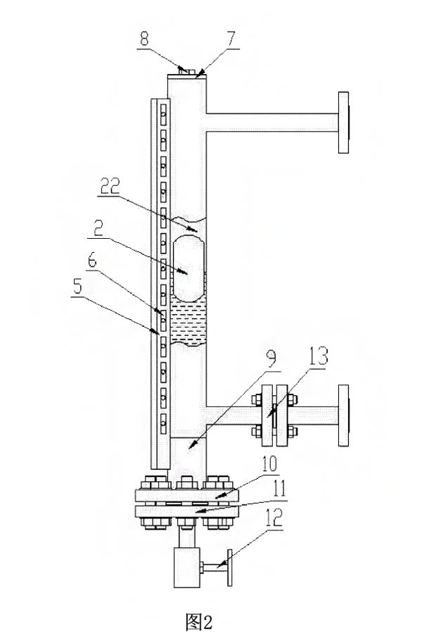 為解決上述技術問題,包括液位計主體和磁浮球,液位計主體為內部設有磁浮球通道的圓柱體,磁浮球安裝在液位計主體的磁浮球通道內,液位計主體上通過卡箍固定安裝有顯示面板,顯示面板上設有顯示刻度,顯示面板中間開設有安裝顯示槽,安裝顯示槽內安裝有機玻璃管,有機玻璃管內安裝有若干個磁翻板,磁翻板表面貼有熒光片,液位計主體頂部設有上封頭,上封頭上安裝有用于放氣的上螺栓,液位計主體底部安裝有氣泡消除器,氣泡消除器下側固定安裝有連接法蘭,連接法蘭通過緊固螺栓固定安裝有排污法蘭,排污法蘭下側固定連接有排污閥門,液位計主體的一側安裝有兩個過程法蘭。