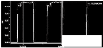 灌裝頭的終出口部分為10~14mm的可更換縮口。通過(guò)縮口,可以產(chǎn)生背壓,一般縮口內(nèi)置蜂窩狀虹吸管,保證灌裝前后的管道滿管。從測(cè)試的流量波形上看,10mm的灌裝頭產(chǎn)生適當(dāng)?shù)淖枘嵝Ч?,流量曲線較穩(wěn)定。