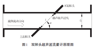 本研究針對一款雙探頭時差法超聲波流量計。時差法是利用聲脈沖波在流體中順向與逆向傳播的時間差來測量流體流速。雙探頭超聲波流量計原理圖如圖1所示。