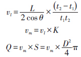 順向和逆向的傳播時間為t1 和t2 ,聲道線與管道壁面夾角為θ ,管道的橫截面積為S ,聲道線上的線平均流速vl 和體積流量Q 的表達式: