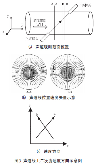 式中:d —管道直徑,R —彎管的曲率半徑。彎管下游形成的二次流在徑向平面的流動,產(chǎn)生了彎管二次流的垂直誤差和水平誤差。聲道線上二次流速度方向示意圖如圖3所示。本研究在聲道線路徑上取兩個觀察面A和B,如圖3(a)所示;聲道線穿過這兩個二次流面的位置為a和b,如圖3(b)所示??梢娪捎诼暤谰€穿過截面上渦的位置不同,作用在聲道線上的二次流速度方向也不同,如圖3(c)所示。其中,徑向平面二次流速度在水平方向( X 方向)上的分速度,方向相反。