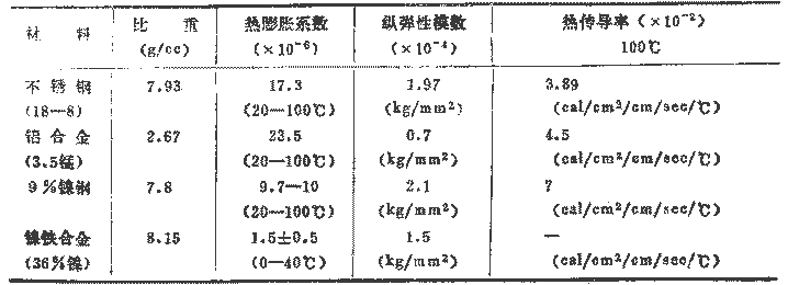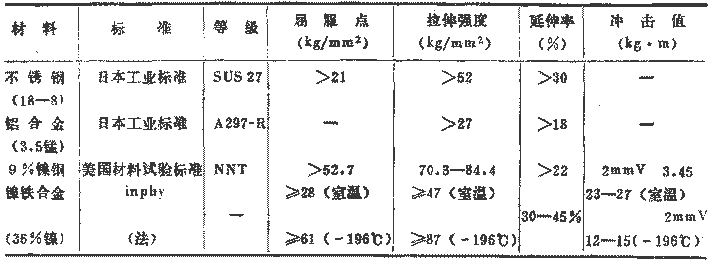 金屬材料在極低溫下的屈服點、拉伸強度、延伸率、節流、沖擊試驗值等機械性質與常溫下有很大不同,在極低溫下,金屬材料的拉伸強度上升,但延展性降低,沖擊值也隨材料而顯著下降。因此,在極低溫下所使用的儀器的材料,應是有充分抗破壞韌性的材料,使之不引起脆性破壞,這些材料就叫做低溫材料。但是,現在使用的一般的材料有:不銹鋼、鋁合金、90%的鎳鋼、35%的鎳鋼(鎳鐵合金)。表3示出了低溫材料的機械性質。圖3還示出了不銹鋼的恰貝遷移溫度曲線。